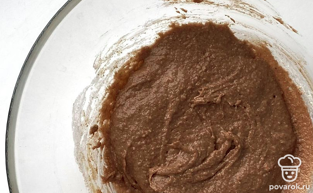 Для теста смешать арахисовую пасту, молоко, масло, банан, какао, сахарозаменитель, муку и яйцо до однородной массы.
