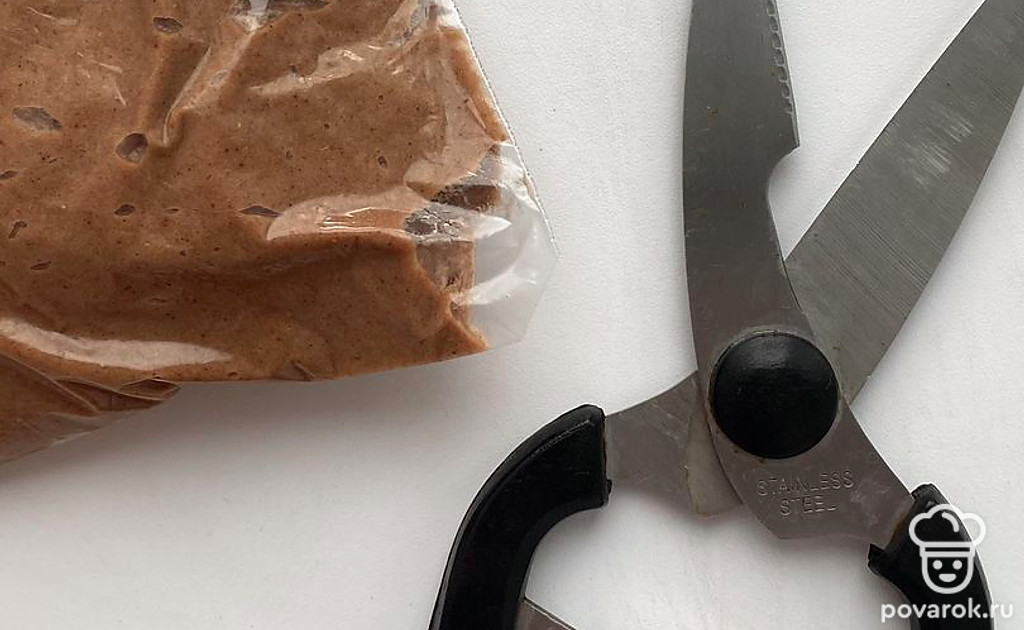 Выложить тесто в кулинарный мешок или пакет, отрезать уголок у пакета.