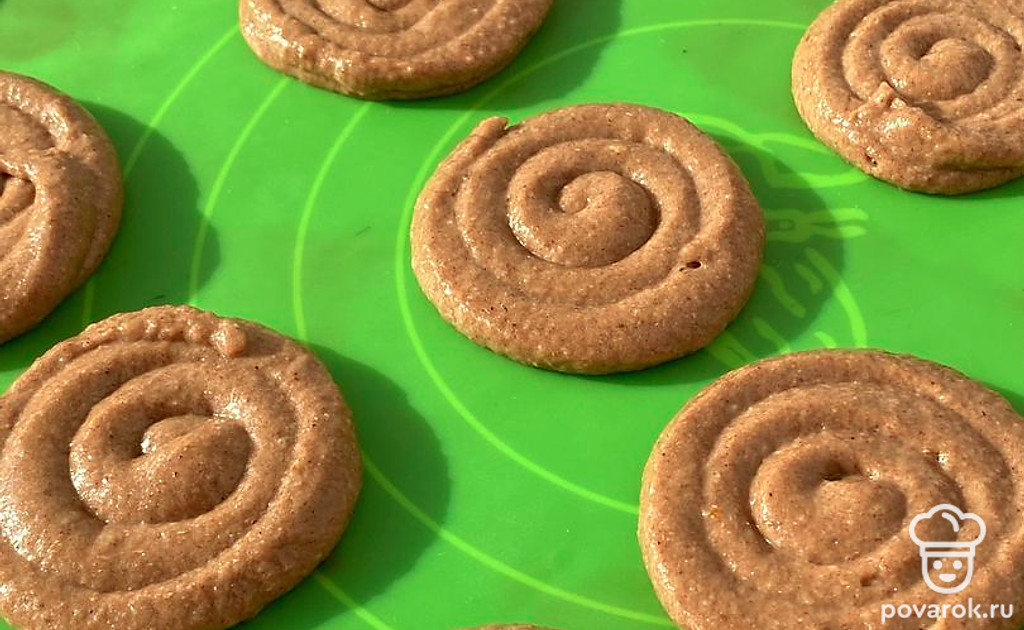 Выдавить тесто на силиконовый коврик в форме плоской улитки. Отправить в разогретую до 180 градусов духовку на 15 минут.