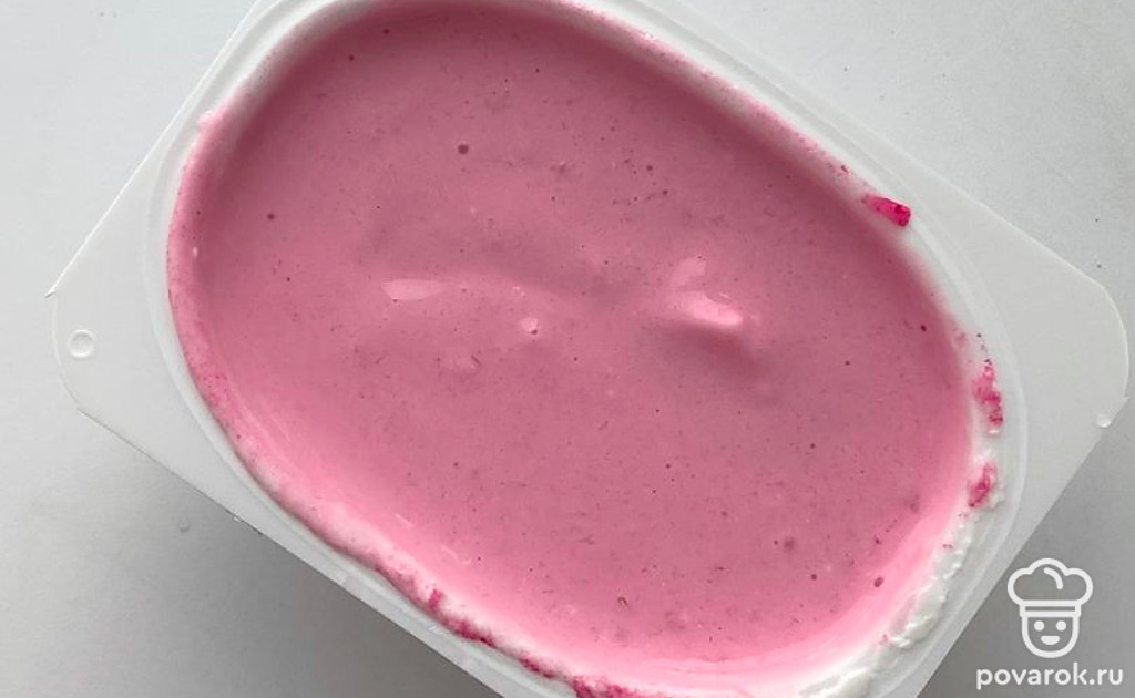 Растопить набухший желатин в микроволновке и смешать с мягким творогом и малиновым сиропом.