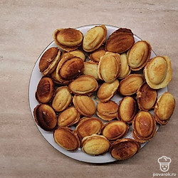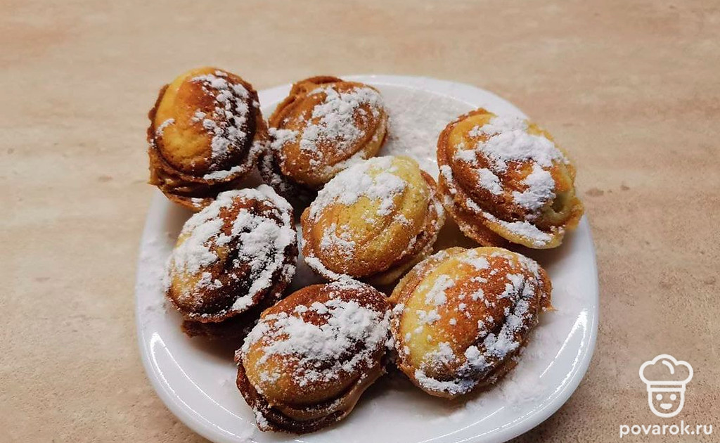 Выложите тесто на смазанную маслом орешницу и выпекайте до красивого золотистого цвета приблизительно 2-3 минуты. Готовому печенью дайте остыть.