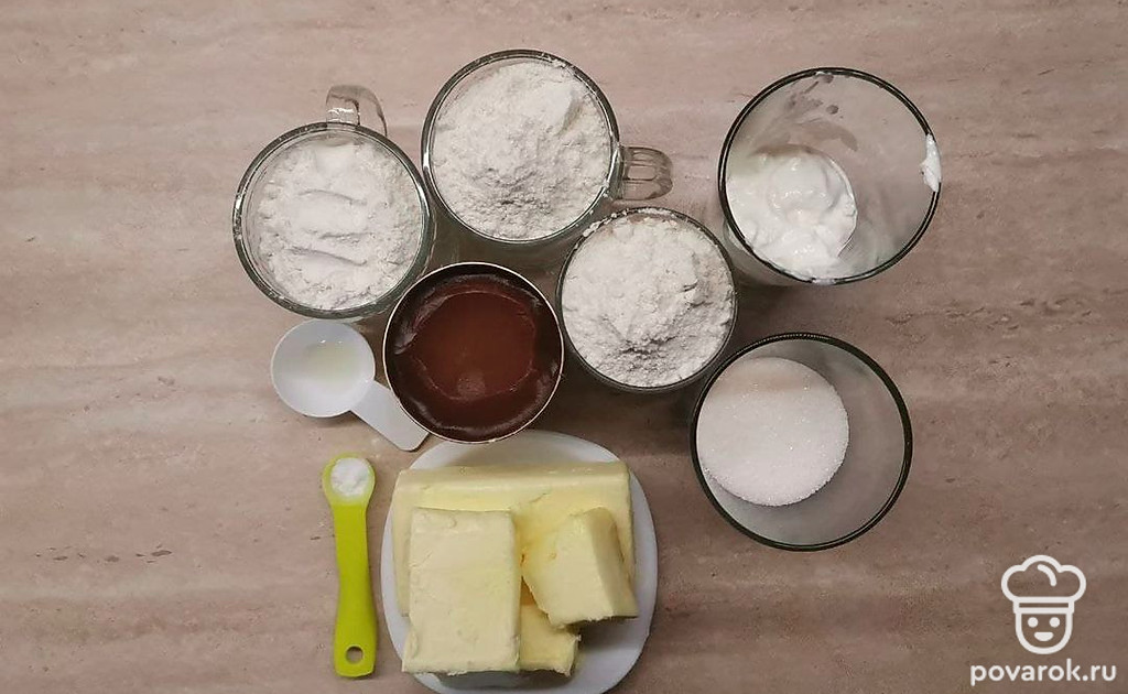 Смешайте сметану, сахар и масло. Соду погасите уксусом и добавьте к смеси. Просейте муку и замесите тесто.