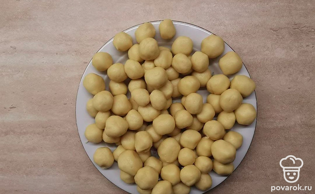 Тесто должно получиться плотным и упругим. Из теста скатайте шарики диаметром 2 см.