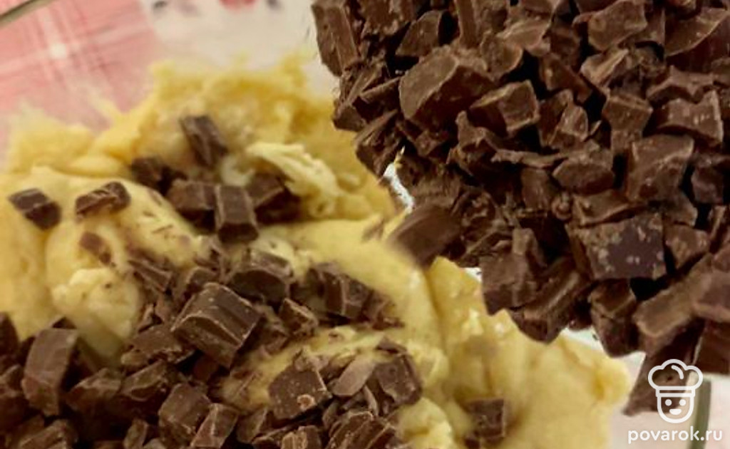 100 грамм молочного или горького шоколада измельчите, разделите на две неравные части, большую добавьте к тесту.