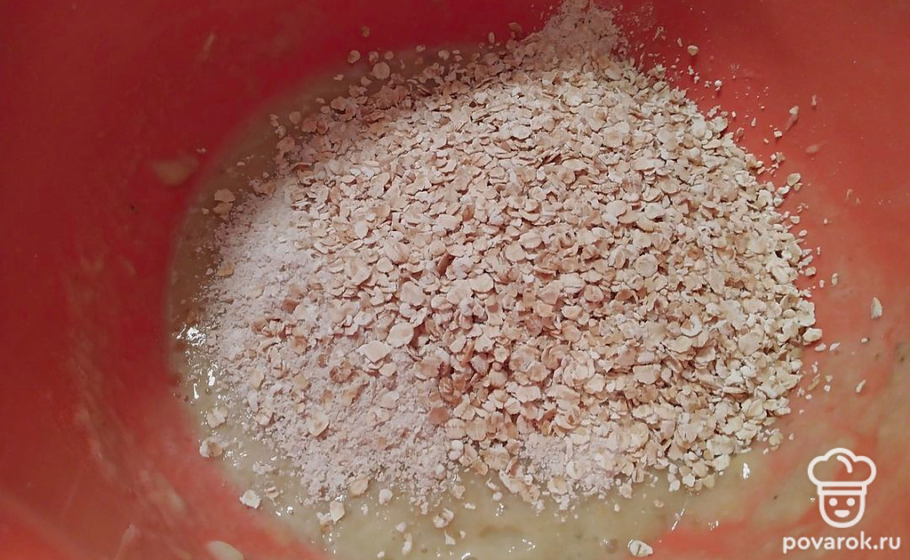 В банановое пюре всыпьте овсяные хлопья, часть хлопьев измельчите блендером и добавьте к бананам.