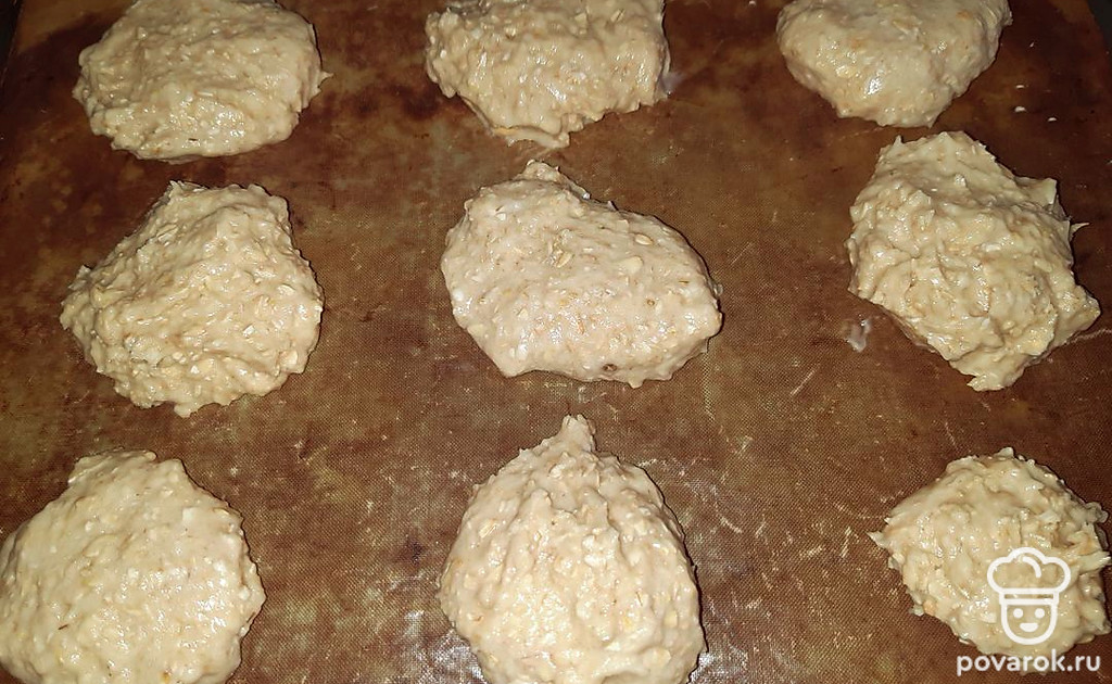 Из теста мокрыми руками сформировать печенье, выложить на пергамент на противень, отправить в разогретую духовку на 180 градусов на 20 минут.