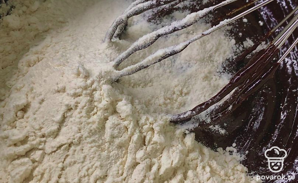 Добавьте просеянную муку и разрыхлитель теста, перемешайте до однородного состояния.