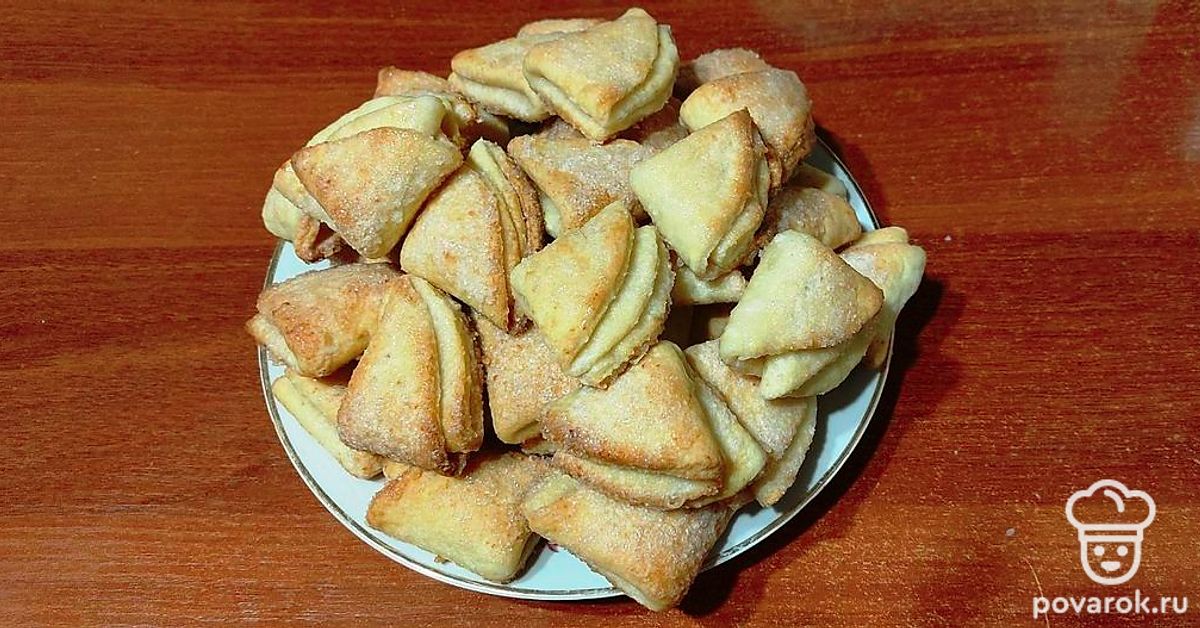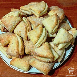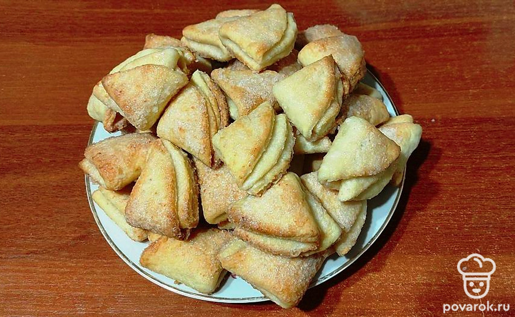 Выложить треугольнички на противень, смазанный маслом. Выпекать 25 минут при температуре духовки 180 градусов.