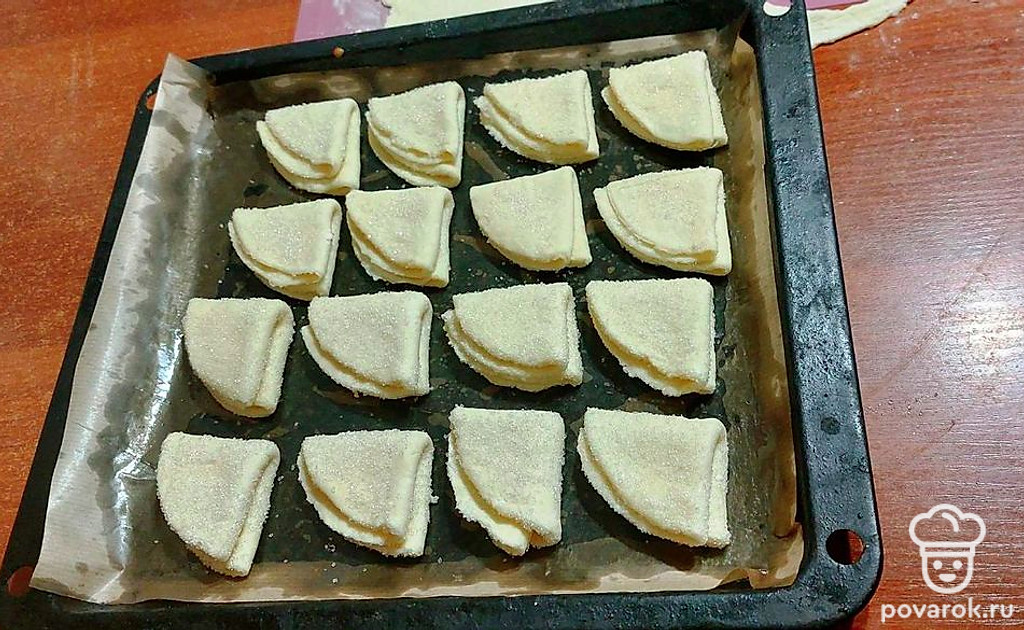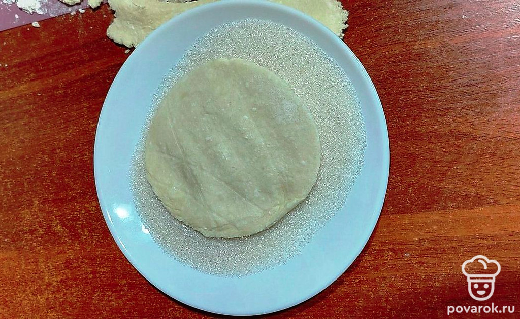 Сложить кружок пополам сахарной стороной вовнутрь и снова обмакнуть в сахар.