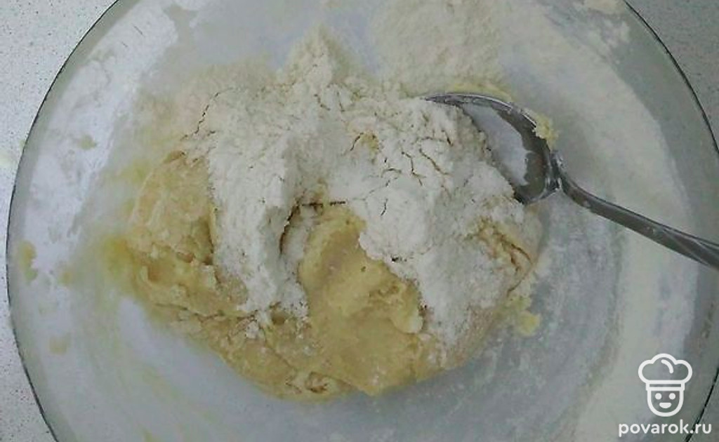 Добавьте разрыхлитель и постепенно введите муку. Замесите тесто.