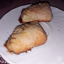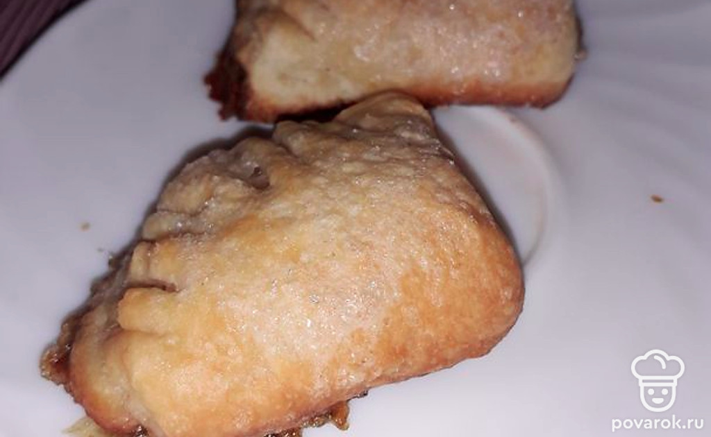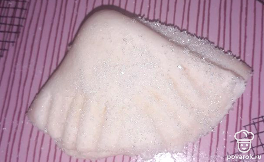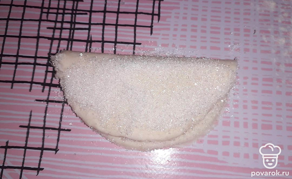 Еще раз сложить пополам и посыпать сахаром. Прищипнуть края вилкой, придав форму гусиных лапок. Запекать в хорошо разогретой духовке при 180 градусов 20-30 минут.
