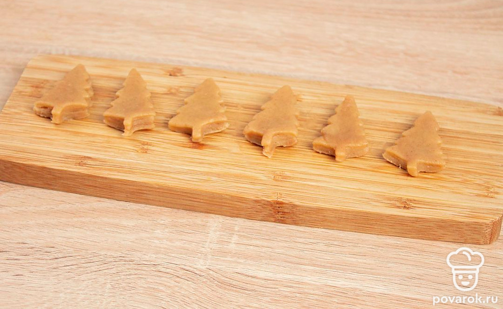 Готовое тесто раскатайте шириной 5-7 мм и формочками вырежьте готовое печенье.