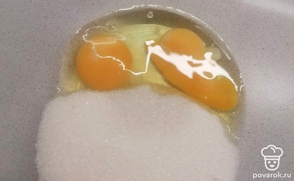 Вбейте 2 яйца в миску и высыпьте весь сахар (и обычный, и ванильный).