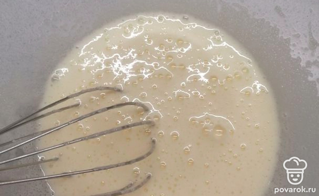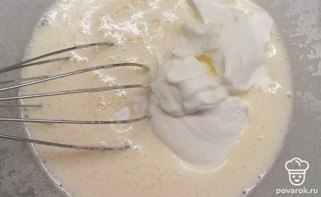 К смеси добавьте сметану, соль, соду и хорошо перемешайте.