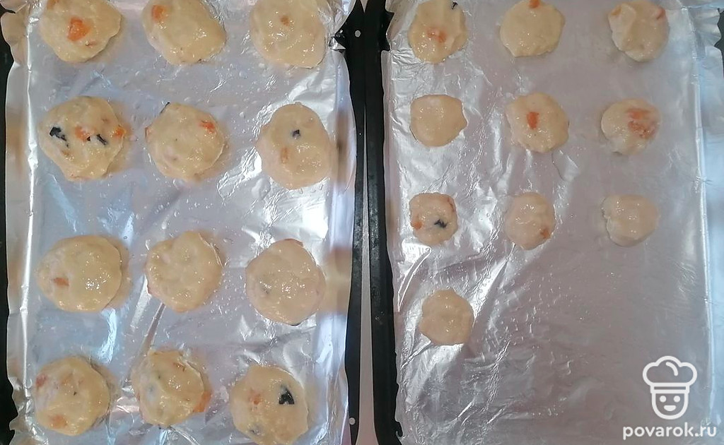 Сформируйте печенье смоченными водой руками и выложите на противень, смазанный маслом.