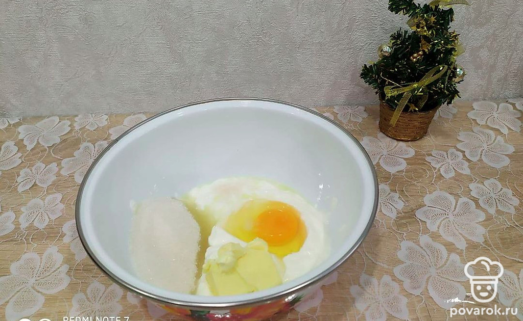 Сметану, сахар, соду, яйцо и размягченное сливочное масло смешайте в однородную массу.