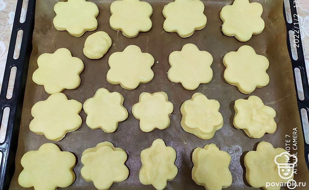 Готовые печеньки выложите на противень, застеленный пергаментной бумагой. Сверху можно смазать сливочным маслом и посыпать сахаром. Выпекайте в разогретой духовке 15 минут при 200 градусах.