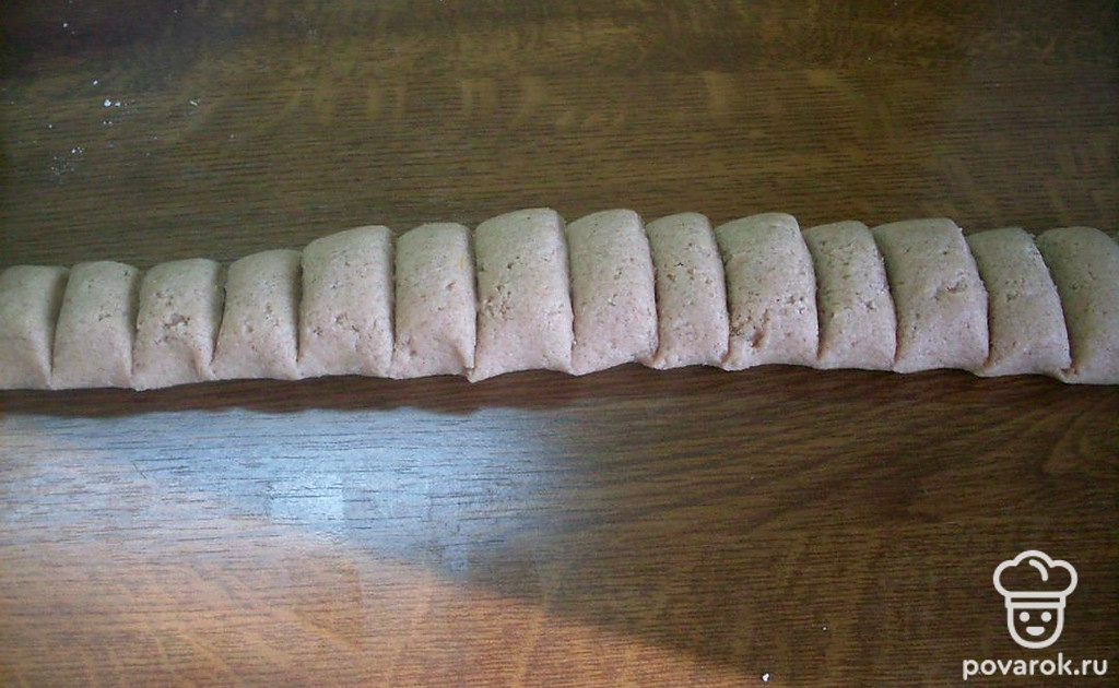 Тесто раскатайте в рулет и нарежьте на одинаковые кусочки.
