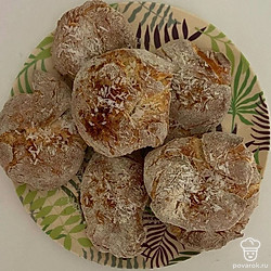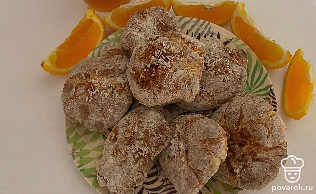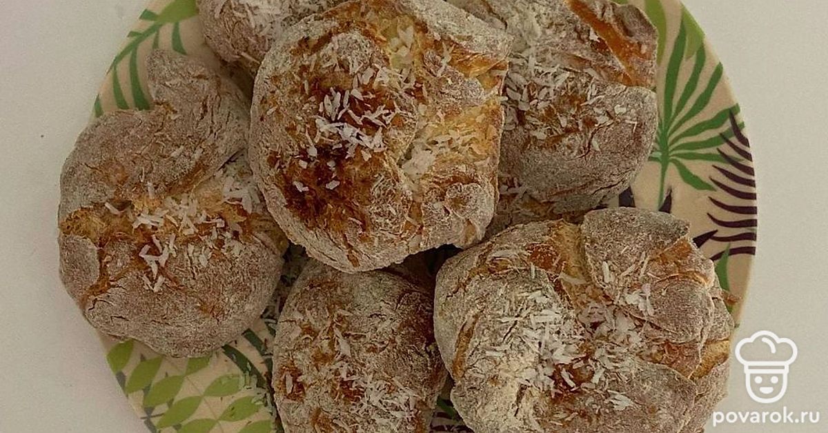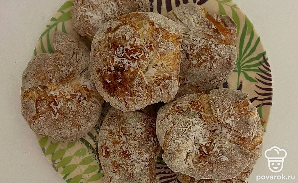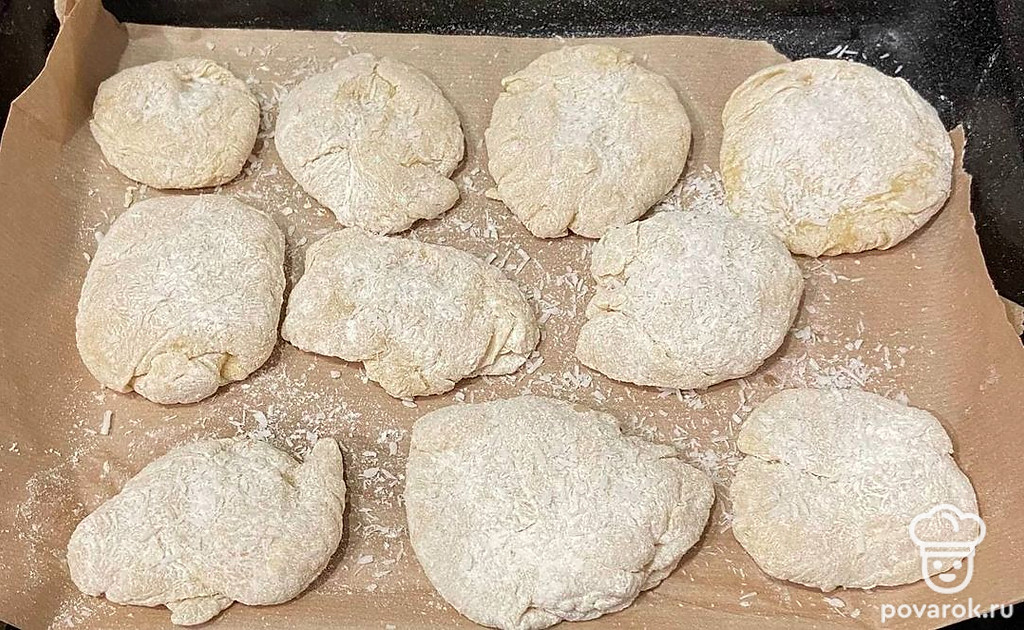 Затем нарежьте тесто на небольшие кусочки. Подготовьте противень с пергаментом и положите на него печенье. Посыпьте кокосовой стружкой и отправьте в духовку на 25 минут.