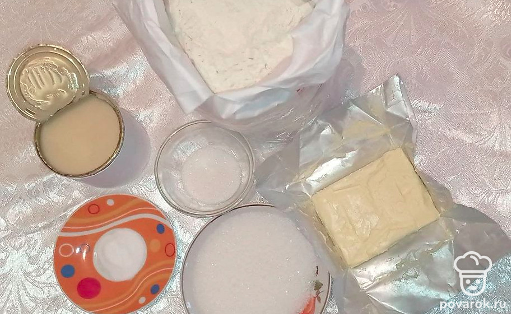 Откройте банку сгущенки, сахар насыпьте в тару, а сливочное масло вытащите из холодильника. Разрыхлитель насыпьте в тарелку. Отмерьте 400 г муки и разместите в пакете.