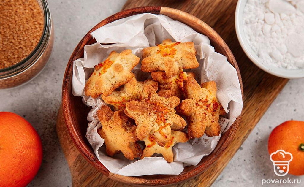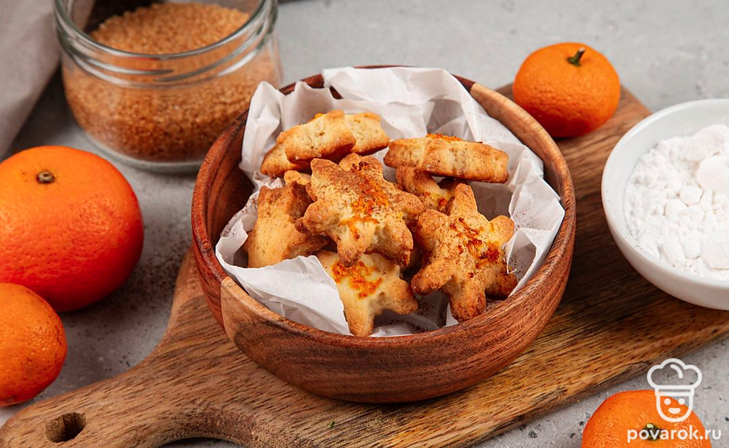 Выложите готовое мандариновое печенье из песочного теста на тарелку. Подавайте с чаем или глинтвейном. Приятного аппетита!