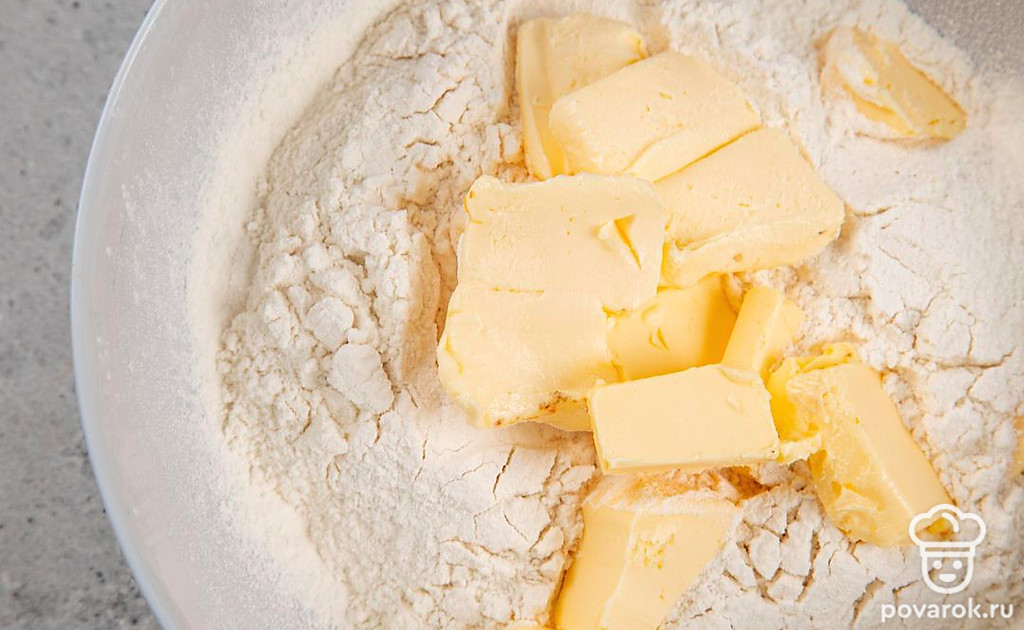 В подходящую емкость поместите муку и размягченное сливочное масло и разотрите их.