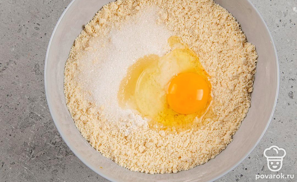 Добавьте сахар, разрыхлитель, кукурузный крахмал и яйцо.