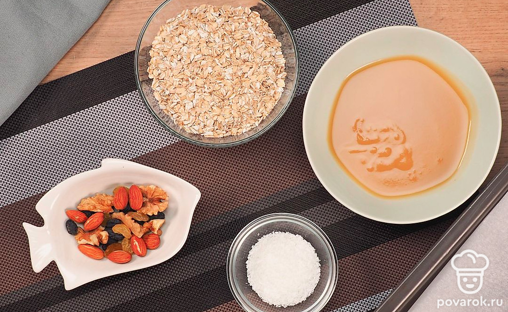 Насыпьте овсяные хлопья в миску и смешайте их с сухофруктами, орехами и кокосовой стружкой. Теперь к полученной смеси добавьте фруктовое пюре и снова все тщательно перемешайте.