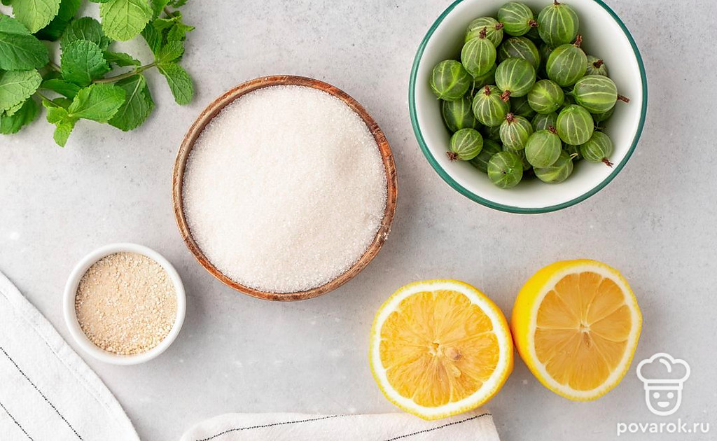 Зеленый крыжовник при варке часто теряет цвет и оригинальный кисловатый вкус, становится коричневым, терпким и приторным. Чтобы при переработке сохранить ягоды максимально похожими на свежие, добавьте в варенье лимон и варите массу не больше 5-6 минут после закипания. Густоту и долгое хранение варенью обеспечит желирующий сахар, в состав которого входят пектин и лимонная кислота. Листочки мяты, проварившись с ягодами, придадут варенью вместе с кислинкой лимона освежающий вкус и аромат. Из указанного количества ингредиентов получается одна баночка варенья объемом 0,5 л.