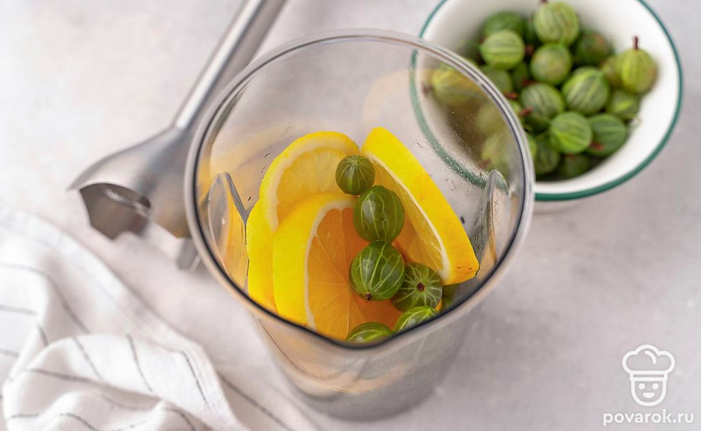 Нарежьте лимон круглыми ломтиками вместе с кожурой, удалите из него косточки. Положите в блендер кусочки лимона и крыжовник, пробейте все до состояния пюре.