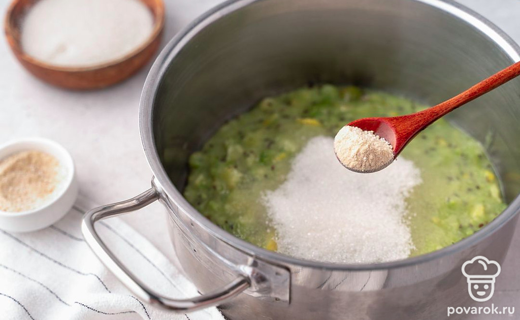 Всыпьте в кастрюлю с крыжовником и лимоном белый и желирующий сахар. Тщательно перемешайте массу, чтобы сахар начал растворяться.