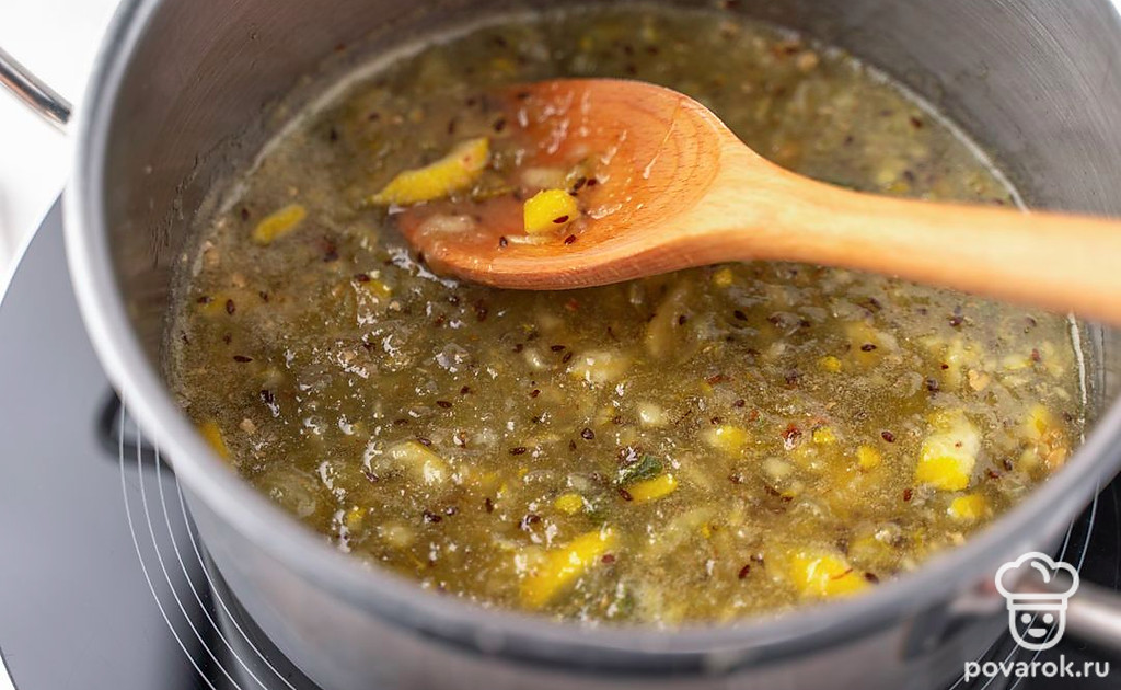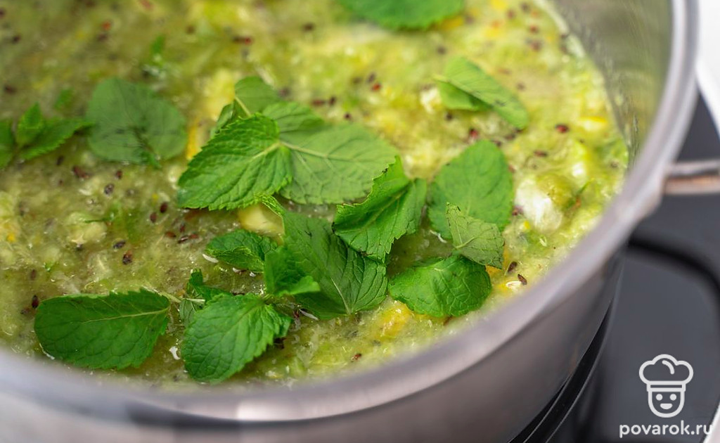 Отделите листочки мяты от стеблей, выложите листья в кастрюлю с крыжовником и лимоном. Еще раз все перемешайте и поставьте кастрюлю на средний огонь.