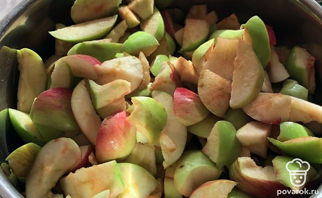 Нарежьте яблоки дольками и сразу уложите в удобную кастрюлю для варки.