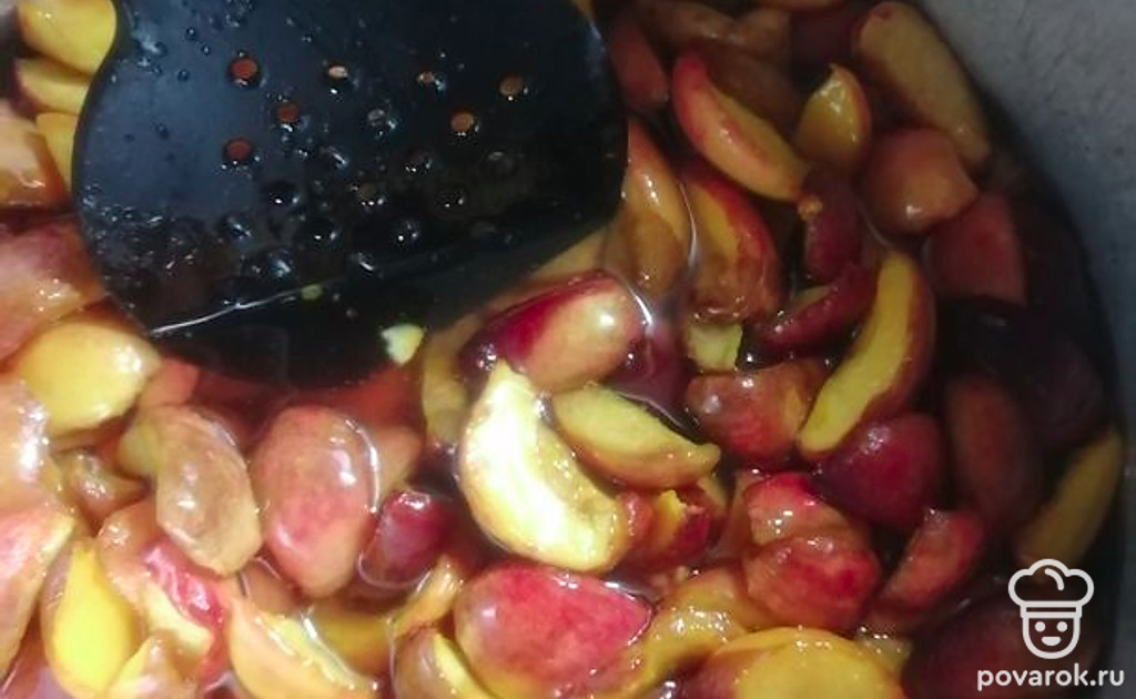 В этот горячий сироп выкладываем нектарины. Аккуратно перемешиваем и оставляем часов на 8. Через восемь часов ставим кастрюлю на огонь и доводим фрукты в сиропе до кипения, аккуратно помешивая. Огонь выключаем и оставляем варенье еще на часов восемь, чтобы дольки пропитались сиропом.