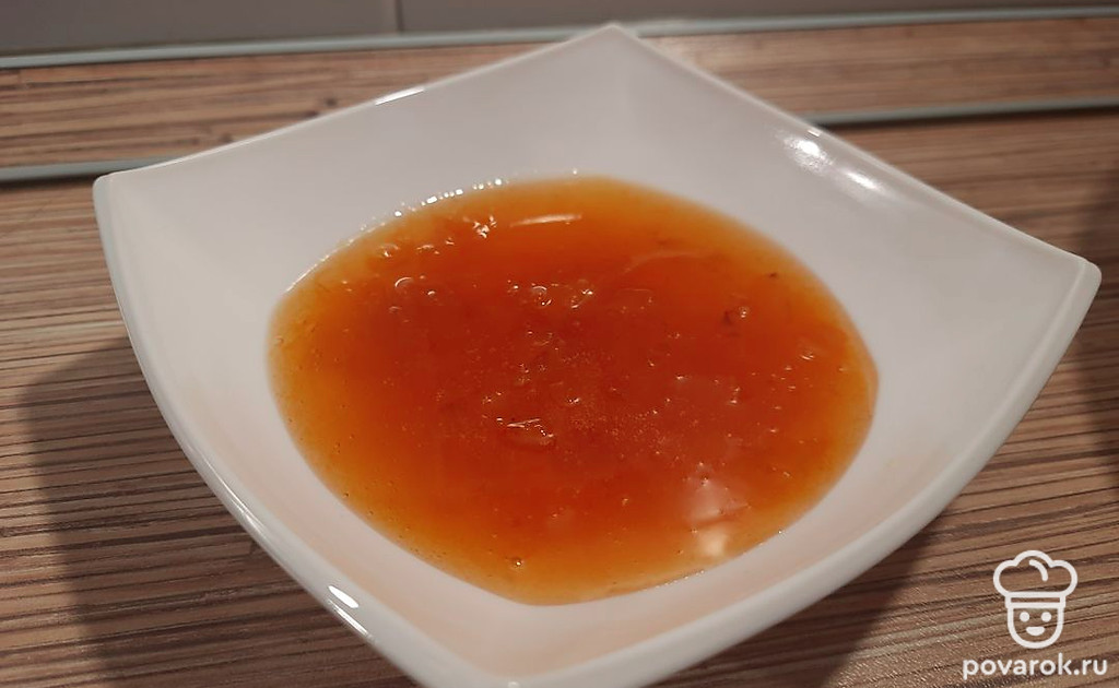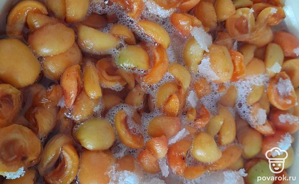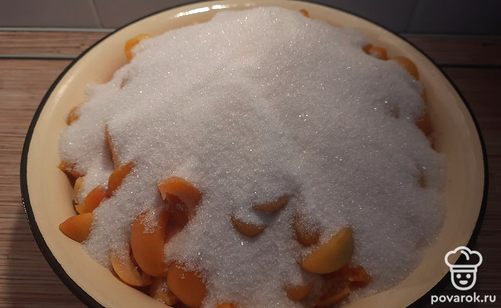 Засыпать сахаром и дать постоять часа 3-4, чтобы выделился сок.