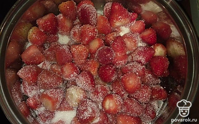 Клубнику помыть и отрезать плодоножку. Положить в кастрюлю, засыпать сахаром. Оставить минут на 30, чтобы дала сок.