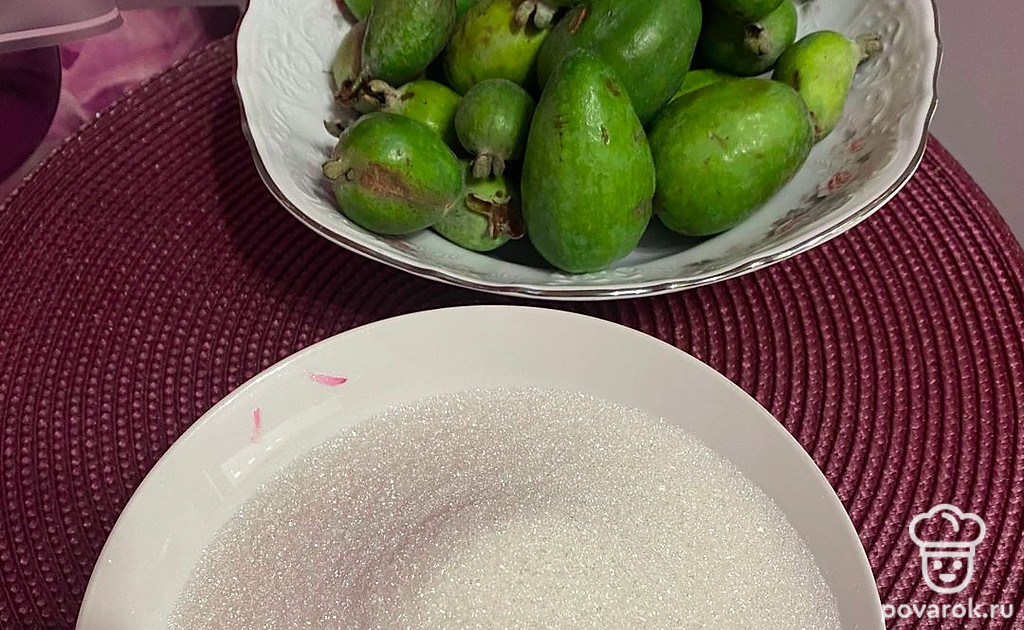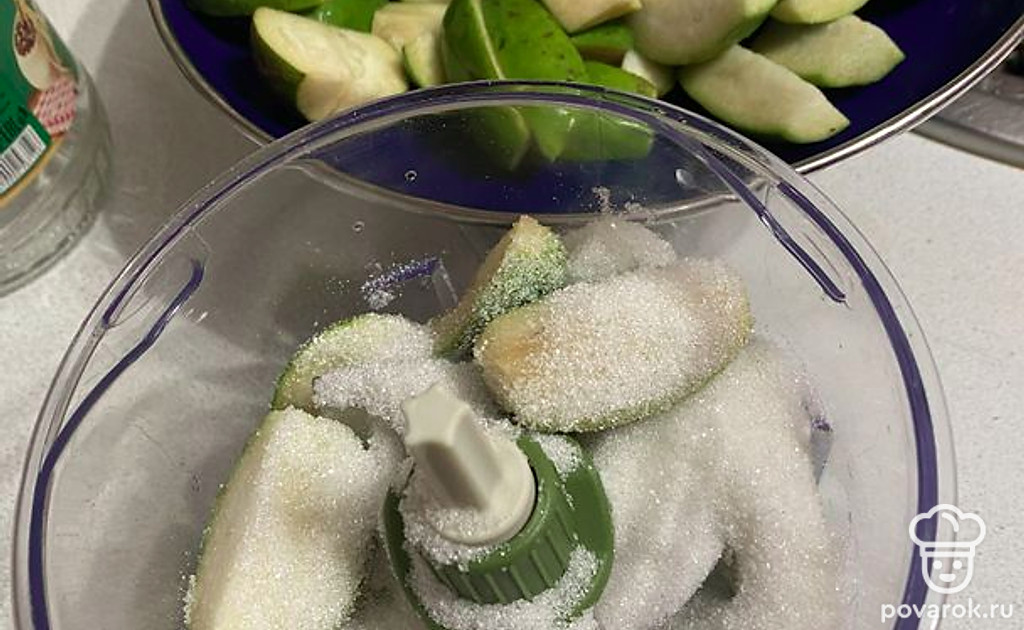 Отрезаем плодоножки. Нарезаем на кусочки. Складываем в измельчитель, добавляем сахар.