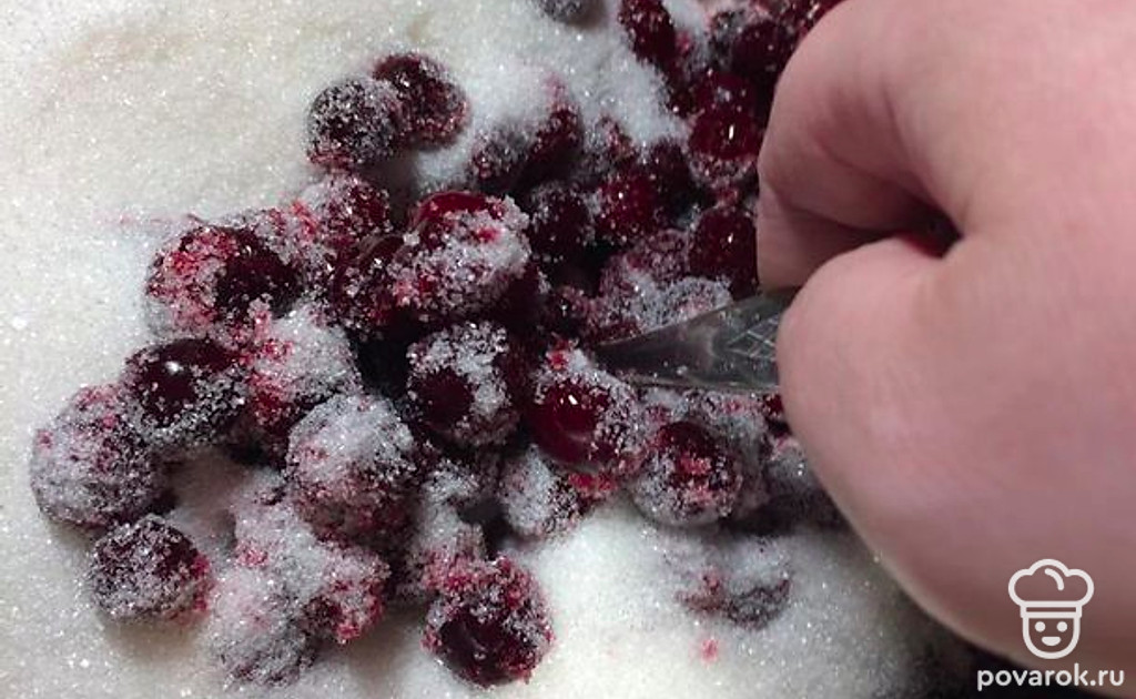 Вишню очистите от косточек и засыпьте сахаром. Оставьте настояться до выделения сока.