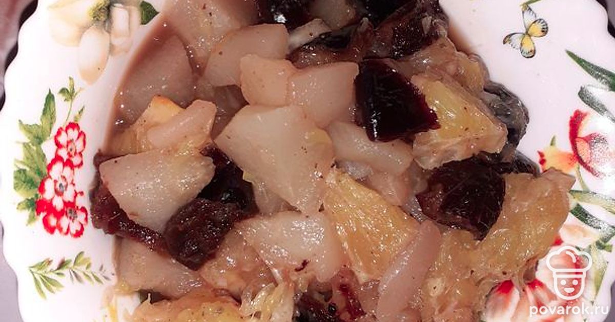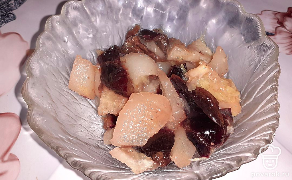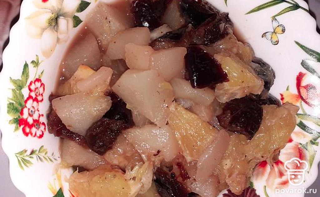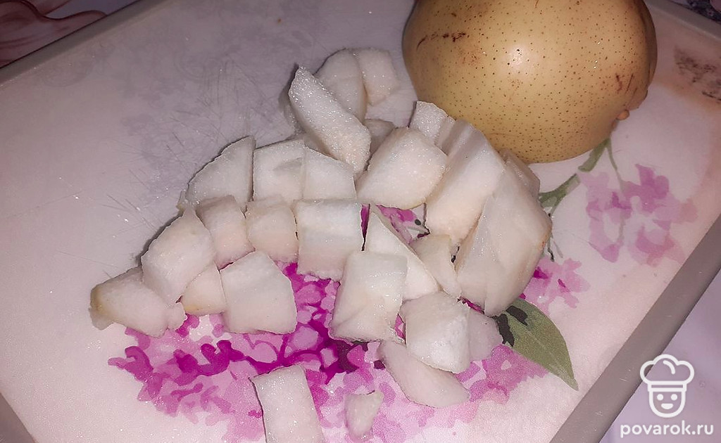 Помыть фрукты и чернослив. Грушу очистить от кожуры и порезать на небольшие кусочки.
